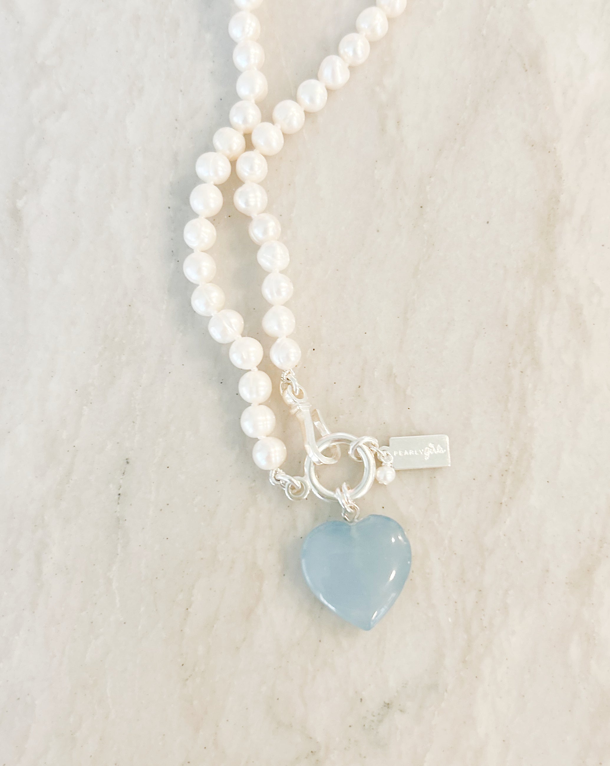We've put a natural blue gemstone in the shape of a heart on our 6mm Ring pearls that are 18" long. Perfect for Valentines Day or any time you're feeling the love. The pearls are strung on a poly/silk thread and has a sterling silver clasp and tag. Arrives in a velvet pouch.