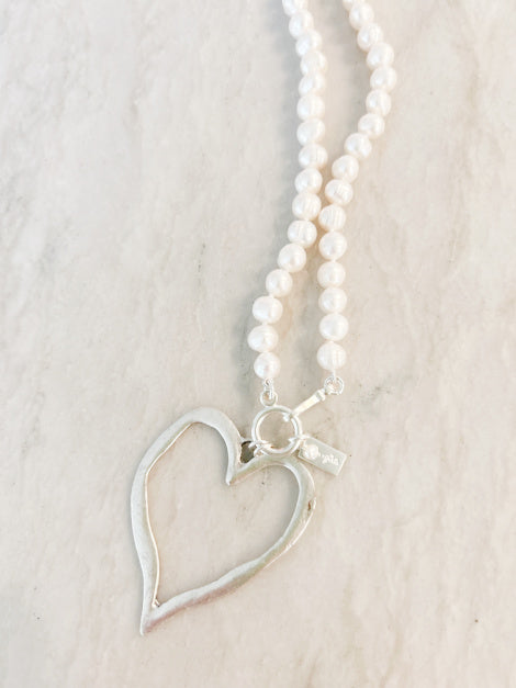 Our 18" ring pearls are pretty, but also strong enough to balance this oversized cut out heart pendant. Fun and whimsy, but makes a sophisticated statement. Our same sterling silver clasp and tag. Arrives in a velvet bag.