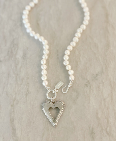 Everyone loves hearts and this big chunky cut out sterling silver heart is beautiful on our 18" freshwater ring pearls. It says it all with the detail and elegant finish. Our pearls are strung on a poly silk thread and have our signature sterling silver clasp and tag. Arrives in a velvet pouch.
